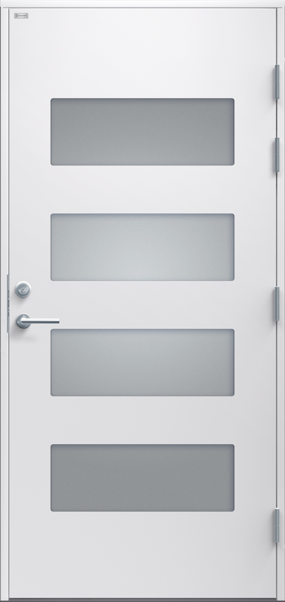 Elegant ytterdörr helt utan dekor. Dörren har fyra lite större, liggande klarglas.