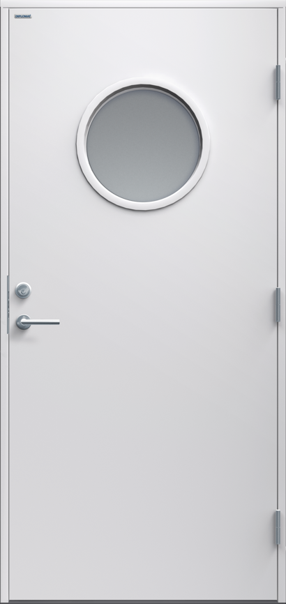 Ytterdörr med helt slät yta utan dekor och runt klarglas. Välj mellan ek, konstteak eller valfri kulör.
