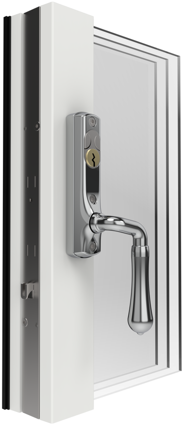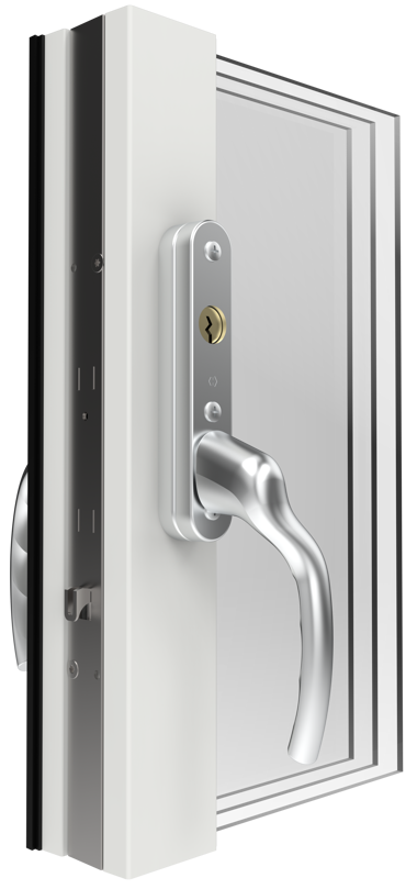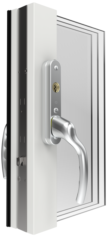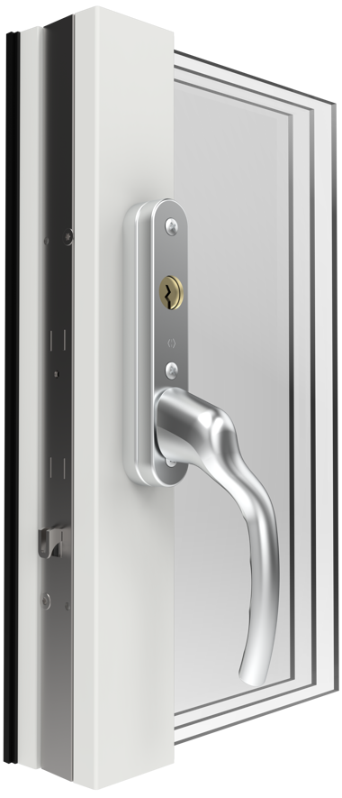 Invändigt svängt handtag, höger eller vänster, utvändigt rakt handtag båda förberedda för låscylinder.
